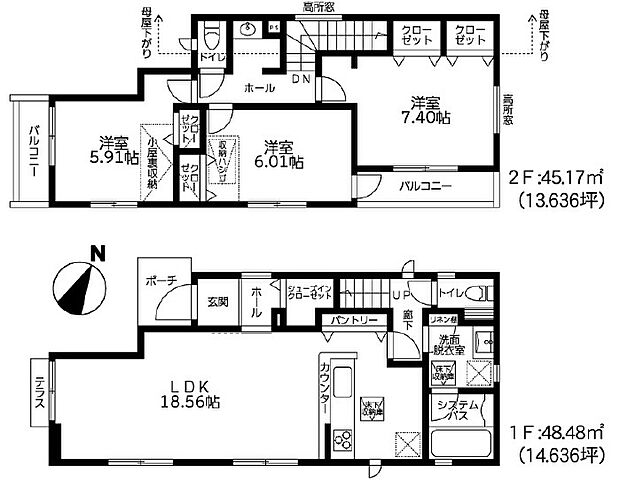 | 間取り | 3LDK 間取り内訳:リビングダイニングキッチン(1階)・洋室 7.4帖(2階)・洋室 6帖(2階)・洋室 5.9帖(2階) |
