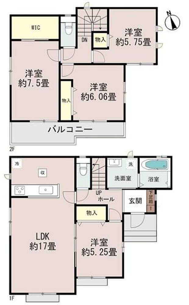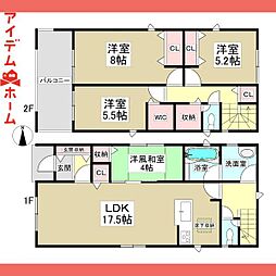 | 間取り | 4LDK 間取り内訳:リビングダイニングキッチン 17帖(1階)・洋室 5.2帖(1階)・洋室 7.5帖(2階)・洋室 6帖(2階)・洋室 5.7帖(2階) |