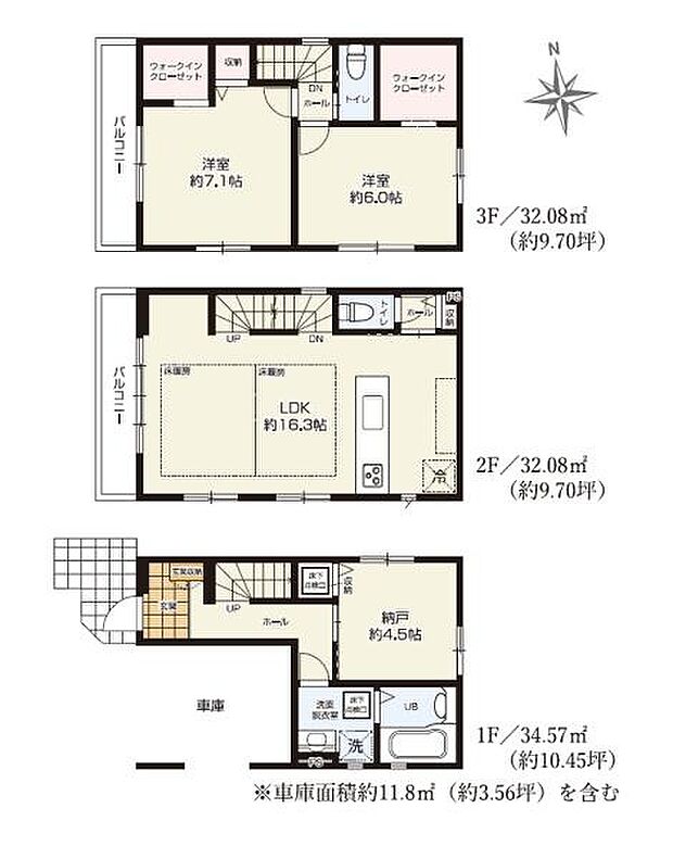 | 間取り | 2SLDK 間取り内訳:収納 4.5帖(1階)・リビングダイニングキッチン 16.3帖(2階)・洋室 7.1帖(3階)・洋室 6帖(3階) |