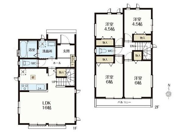 | 間取り | 4LDK 間取り内訳:リビングダイニングキッチン 16帖(1階)・洋室 6帖(2階)・洋室 6帖(2階)・洋室 4.5帖(2階)・洋室 4.5帖(2階) |