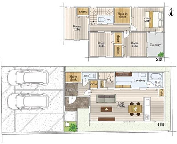 | 間取り | 4LDK 間取り内訳:リビングダイニングキッチン 17.6帖(1階)・洋室 6帖(2階)・洋室 5.2帖(2階)・洋室 4.5帖(2階)・洋室 4.5帖(2階) |