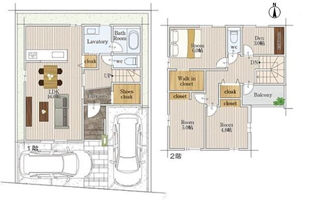 | 間取り | 3LDK 間取り内訳:リビングダイニングキッチン 16帖(1階)・洋室 6帖(2階)・洋室 5帖(2階)・洋室 4.8帖(2階) |