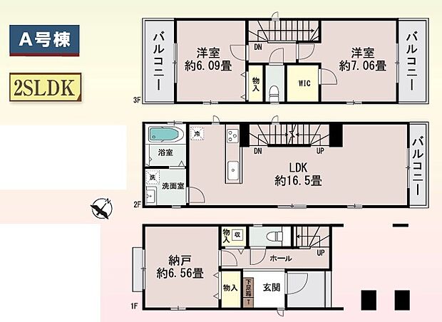 | 間取り | 2SLDK 間取り内訳:収納 6.5帖(1階)・リビングダイニングキッチン 16.5帖(2階)・洋室 6帖(3階)・洋室 7帖(3階) |