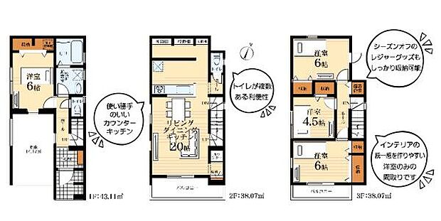 | 間取り | 4LDK 間取り内訳:洋室 6帖(1階)・リビングダイニングキッチン 20帖(2階)・洋室 6帖(3階)・洋室 6帖(3階)・洋室 4.5帖(3階) |
