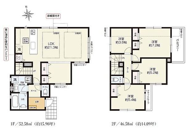 | 間取り | 4LDK 間取り内訳:洋室 5.4帖(2階)・洋室 5.2帖(2階)・洋室 3.8帖(2階)・リビングダイニングキッチン 21.3帖(1階)・洋室 7.2帖(2階) |