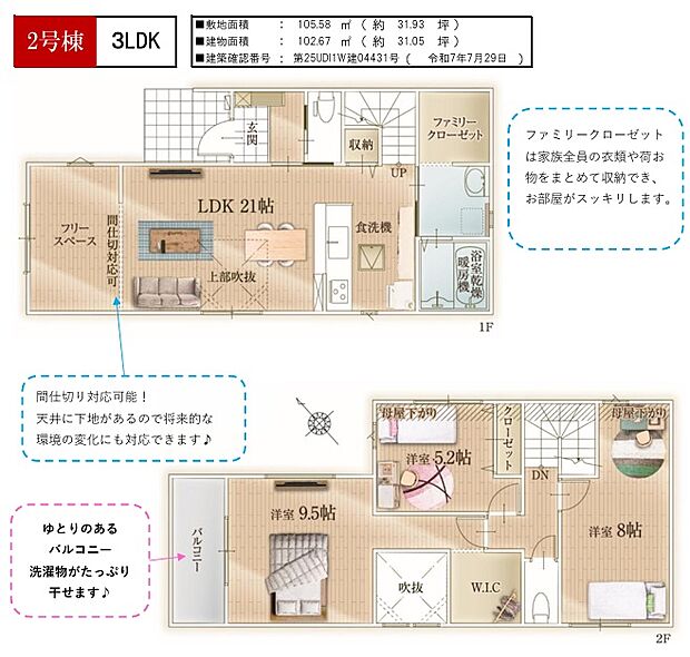 | 間取り | 3LDK 間取り内訳:リビングダイニングキッチン 21帖(1階)・洋室 5.2帖(2階)・洋室 8帖(2階)・洋室 9.5帖(2階) |