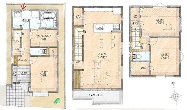 間取り内訳:洋室 6帖(1階)・リビングダイニングキッチン 18帖(2階)・洋室 6帖(3階)・洋室 6帖(3階)