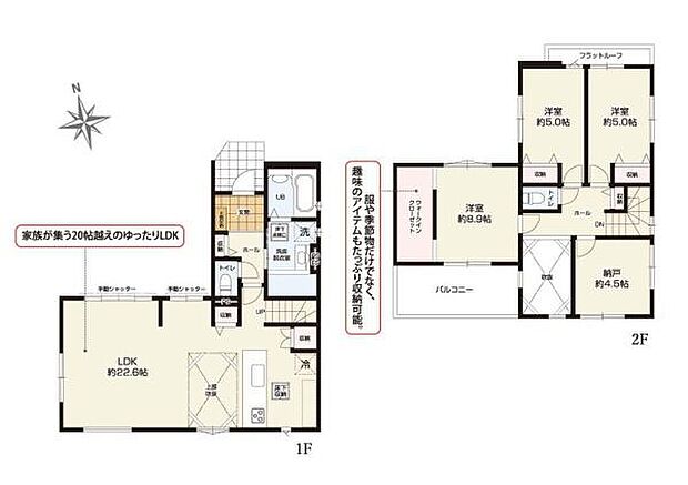 | 間取り | 3SLDK 間取り内訳:リビングダイニングキッチン 22.6帖(1階)・洋室 8.9帖(2階)・収納 4.5帖(2階)・洋室 5帖(2階)・洋室 5帖(2階) |