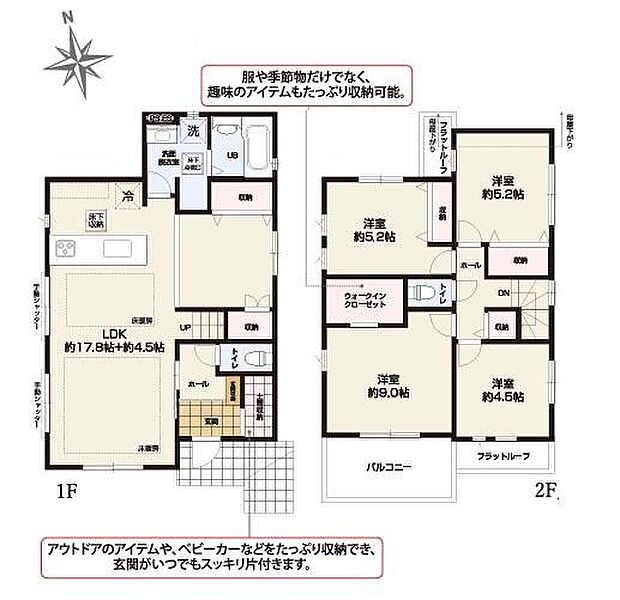 | 間取り | 4LDK 間取り内訳:リビングダイニングキッチン 22.3帖(1階)・洋室 5.2帖(2階)・洋室 9帖(2階)・洋室 4.5帖(2階)・洋室 5.2帖(2階) |