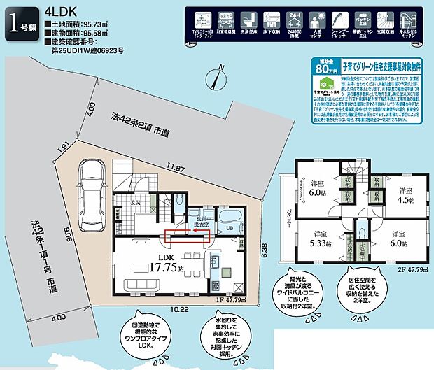 | 間取り | 4LDK 間取り内訳:リビングダイニングキッチン 17.7帖(1階)・洋室 4.5帖(2階)・洋室 5.3帖(2階)・洋室 6帖(2階)x2 |