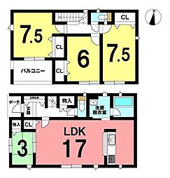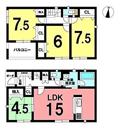 | 間取り | 3LDK 間取り内訳:リビングダイニングキッチン 21帖(1階)・洋室 7.5帖(2階)・洋室 7.5帖(2階)・洋室 6帖(2階) |