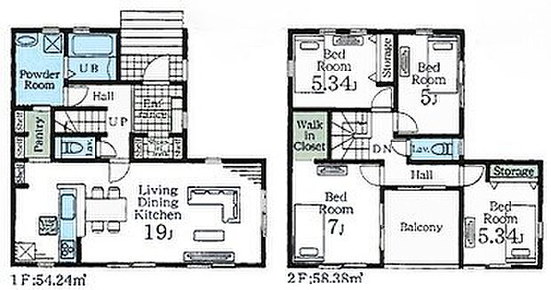 | 間取り | 4LDK 間取り内訳:リビングダイニングキッチン 19帖(1階)・洋室 7帖(2階)・洋室 5.3帖(2階)x2・洋室 5帖(2階) |