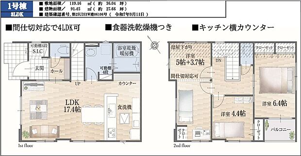 | 間取り | 3LDK(将来4LDKに対応可。) 間取り内訳:リビングダイニングキッチン 17.4帖(1階)・洋室 4.4帖(2階)・洋室 6.4帖(2階)・洋室 8.7帖(2階) |