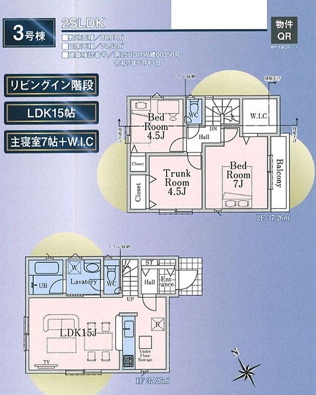 | 間取り | 2SLDK 間取り内訳:リビングダイニングキッチン 15帖(1階)・洋室 4.5帖(2階)・洋室 7帖(2階)・収納 4.5帖(2階) |