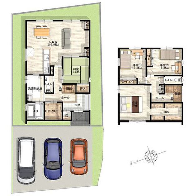 | 間取り | 4LDK 間取り内訳:リビングダイニングキッチン 16.9帖(1階)・和室 4.5畳(1階)・洋室 7帖(2階)・洋室 5.3帖(2階)・洋室 5.3帖(2階) |