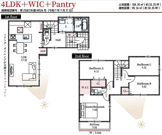 間取り内訳:リビングダイニングキッチン 17.5帖(1階)・洋室 5帖(2階)・洋室 5.5帖(2階)・洋室 6.1帖(2階)・洋室 7帖(2階)