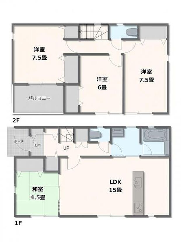 | 間取り | 4LDK 間取り内訳:リビングダイニングキッチン 15帖(1階)・和室 4.5畳(1階)・洋室 7.5帖(2階)x2・洋室 6帖(2階) |
