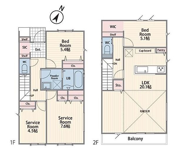 | 間取り | 2SLDK 間取り内訳:収納 4.5帖(1階)・収納 7.6帖(1階)・洋室 5.4帖(1階)・洋室 5.1帖(2階)・リビングダイニングキッチン 20.1帖(2階) |