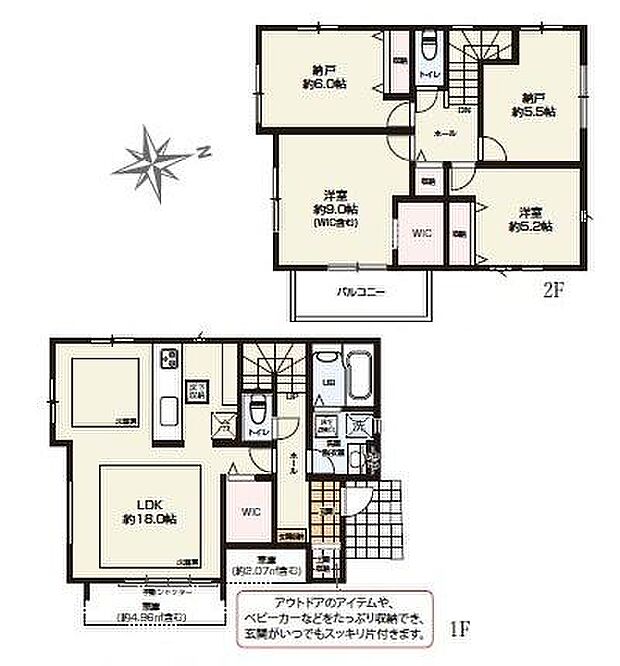 | 間取り | 2SLDK 間取り内訳:リビングダイニングキッチン 18帖(1階)・収納 6帖(2階)・洋室 9帖(2階)・洋室 5.2帖(2階)・収納 5.5帖(2階) |