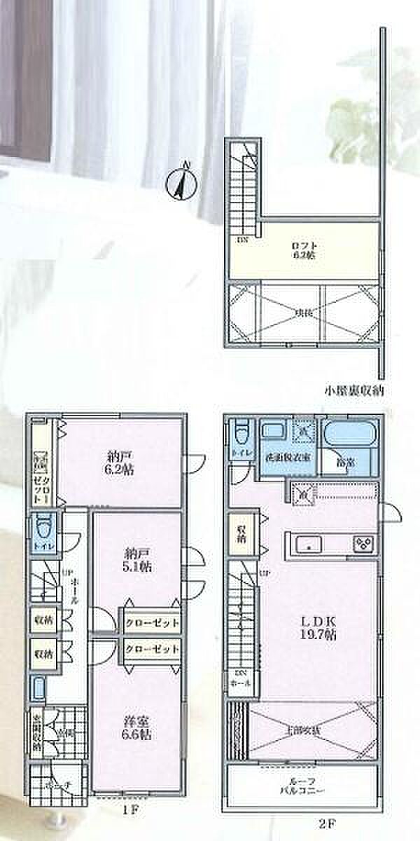 | 間取り | 1SLDK 間取り内訳:収納 6.2帖(1階)・収納 5.1帖(1階)・洋室 6.6帖(1階)・リビングダイニングキッチン 19.7帖(2階) |