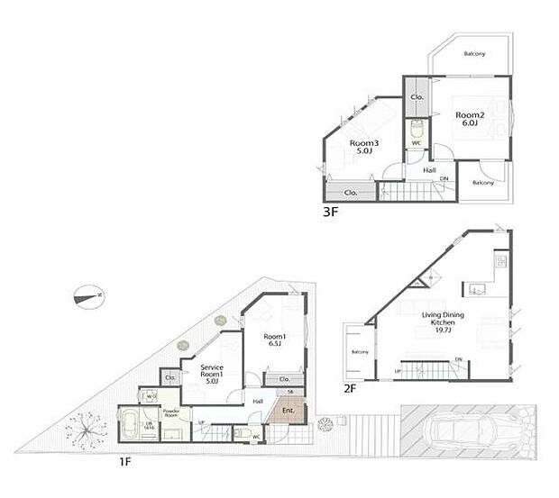 | 間取り | 3SLDK 間取り内訳:収納 5帖(1階)・洋室 6.5帖(1階)・リビングダイニングキッチン 19.7帖(2階)・洋室 5帖(3階)・洋室 6帖(3階) |