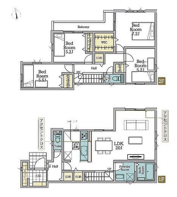 | 間取り | 4LDK 間取り内訳:リビングダイニングキッチン 20帖(1階)・洋室 5.5帖(2階)・洋室 5.2帖(2階)・洋室 5.2帖(2階)・洋室 7.2帖(2階) |