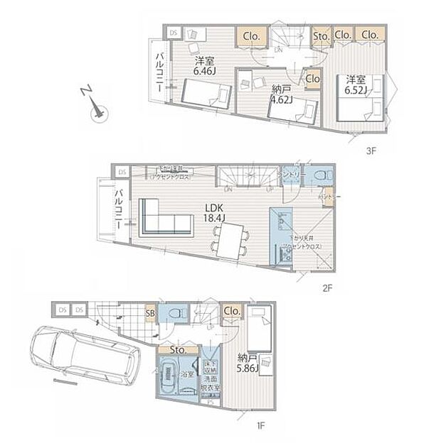 | 間取り | 2SLDK 間取り内訳:収納 5.8帖(1階)・リビングダイニングキッチン 18.4帖(2階)・洋室 6.4帖(3階)・収納 4.6帖(3階)・洋室 6.5帖(3階) |