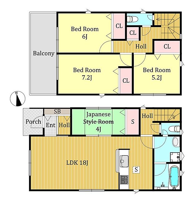 | 間取り | 4LDK 間取り内訳:リビングダイニングキッチン 18帖(1階)・和室 4畳(1階)・洋室 6帖(2階)・洋室 7.2帖(2階)・洋室 5.2帖(2階) |
