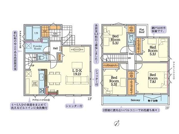 | 間取り | 4LDK 間取り内訳:リビングダイニングキッチン 19.2帖(1階)・洋室 5.3帖(2階)・洋室 5.3帖(2階)・洋室 7.8帖(2階)・洋室 5.3帖(2階) |