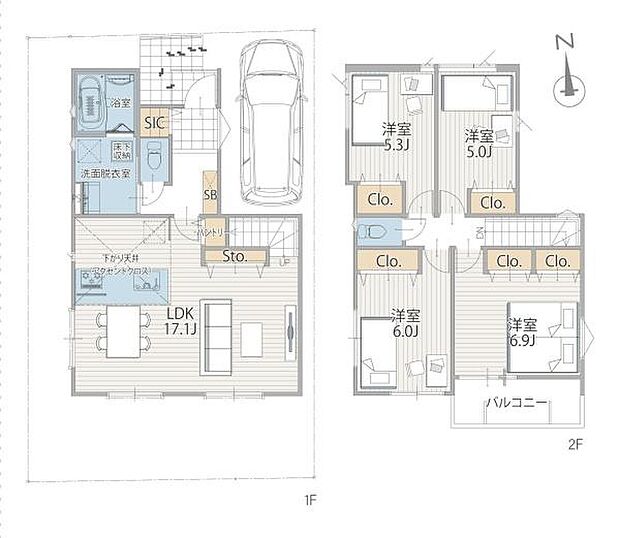 | 間取り | 4LDK 間取り内訳:リビングダイニングキッチン 17.1帖(1階)・洋室 6帖(2階)・洋室 6.9帖(2階)・洋室 5帖(2階)・洋室 5.3帖(2階) |