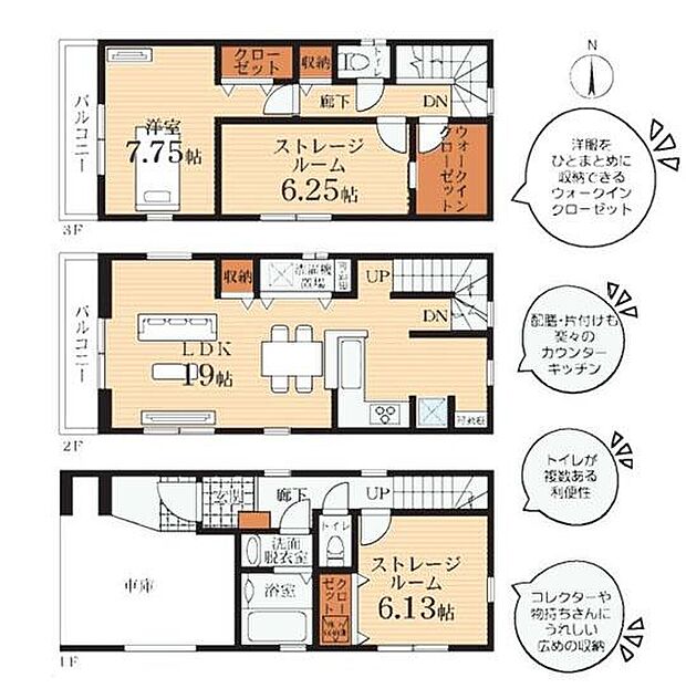 | 間取り | 1SLDK 間取り内訳:収納 6.1帖(1階)・リビングダイニングキッチン 19帖(2階)・洋室 7.7帖(3階)・収納 6.2帖(3階) |