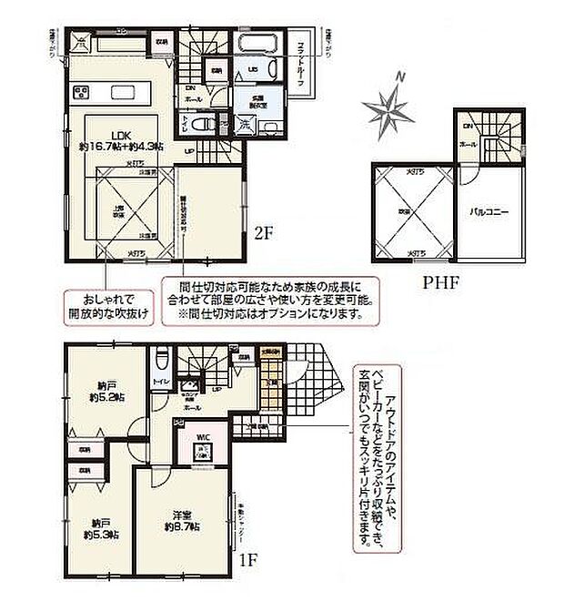 | 間取り | 1SLDK 間取り内訳:収納 5.2帖(1階)・収納 5.3帖(1階)・洋室 8.7帖(1階)・リビングダイニングキッチン 21帖(2階) |
