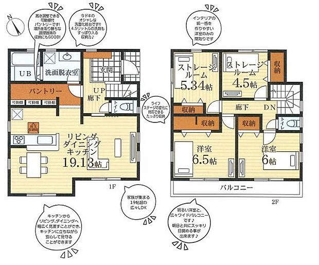 | 間取り | 2SLDK 間取り内訳:リビングダイニングキッチン 19.1帖(1階)・洋室 6.5帖(2階)・洋室 6帖(2階)・収納 4.5帖(2階)・収納 5.3帖(2階) |