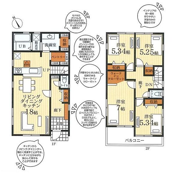 | 間取り | 4LDK 間取り内訳:リビングダイニングキッチン 18帖(1階)・洋室 7帖(2階)・洋室 5.3帖(2階)・洋室 5.2帖(2階)・洋室 5.3帖(2階) |