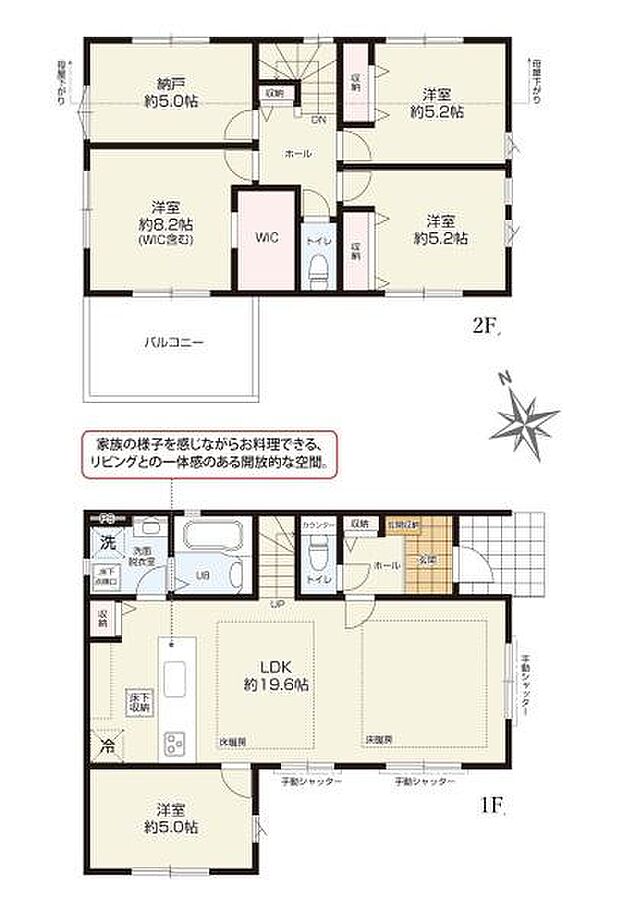 | 間取り | 4SLDK 間取り内訳:リビングダイニングキッチン 19.6帖(1階)・洋室 5帖(1階)・洋室 8.2帖(2階)・洋室 5.2帖(2階)・洋室 5.2帖(2階)・収納 5帖(2階) |