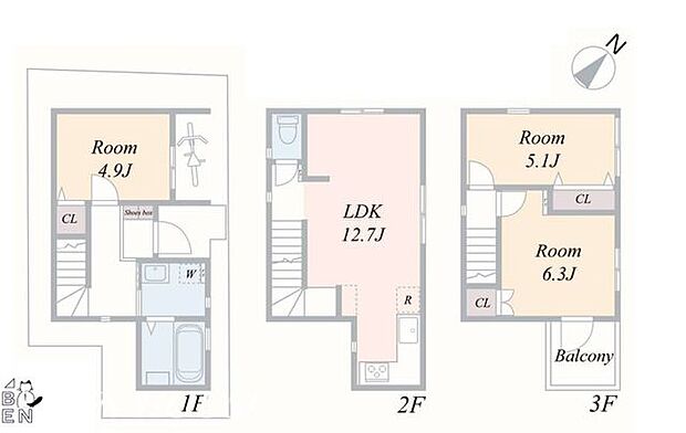 | 間取り | 3LDK 間取り内訳:リビングダイニングキッチン 12.7帖(2階)・洋室 6.3帖(3階)・洋室 5.1帖(3階)・洋室 4.9帖(1階) |