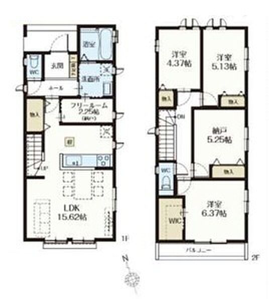 | 間取り | 3LDK(3LDK+納戸+WIC+フリールーム(納戸)) 間取り内訳:リビングダイニングキッチン 15.6帖(1階)・洋室 6.3帖(2階)・収納 5.2帖(2階)・洋室 5.1帖(2階)・洋室 4.3帖(2階) |