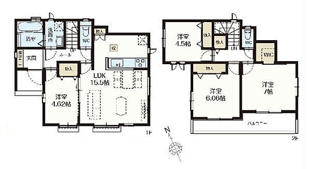 | 間取り | 4LDK(4LD+WIC) 間取り内訳:リビングダイニングキッチン 15.5帖(1階)・洋室 4.6帖(1階)・洋室 4.5帖(2階)・洋室 6帖(2階)・洋室 7帖(2階) |