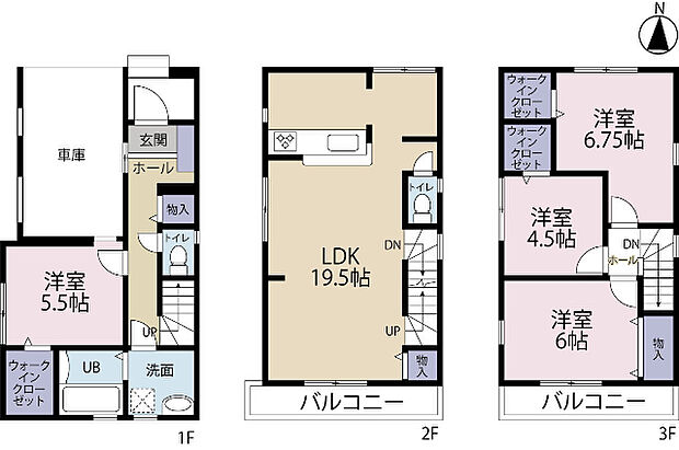 | 間取り | 4LDK 間取り内訳:洋室 5.5帖(1階)・リビングダイニングキッチン 19.5帖(2階)・洋室 6.7帖(3階)・洋室 6帖(3階)・洋室 4.5帖(3階) |