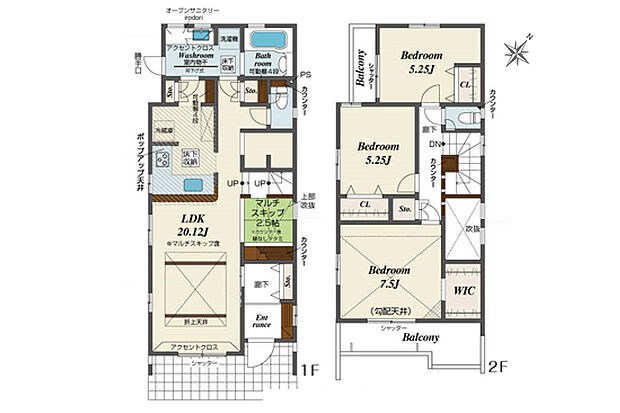 | 間取り | 3LDK 間取り内訳:リビングダイニングキッチン 20.1帖(1階)・洋室 7.5帖(2階)・洋室 5.2帖(2階) |