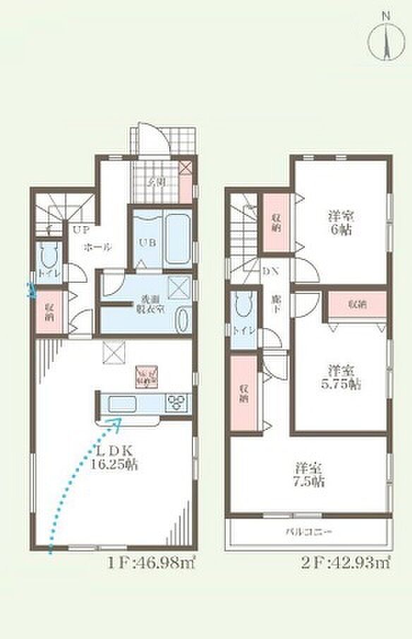 間取り内訳:リビングダイニングキッチン 16.2帖(1階)・洋室 5.7帖(2階)・洋室 6帖(2階)・洋室 7.5帖(2階)
