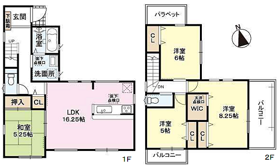 | 間取り | 4LDK 間取り内訳:リビングダイニングキッチン 16.2帖(1階)・和室 5.2畳(1階)・洋室 5帖(2階)・洋室 6帖(2階)・洋室 8.2帖(2階) |