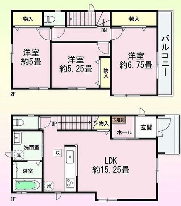 | 間取り | 3LDK 間取り内訳:リビングダイニングキッチン 15.2帖(1階)・洋室 5帖(2階)・洋室 5.2帖(2階)・洋室 6.7帖(2階) |