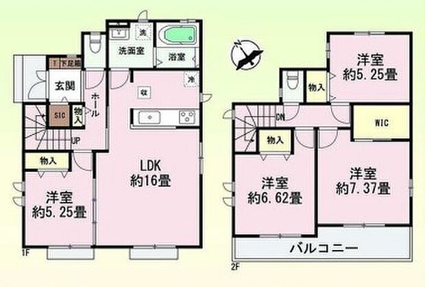 | 間取り | 4LDK 間取り内訳:洋室 5.2帖(1階)・リビングダイニングキッチン 16帖(1階)・洋室 5.2帖(2階)・洋室 7.3帖(2階)・洋室 6.6帖(2階) |