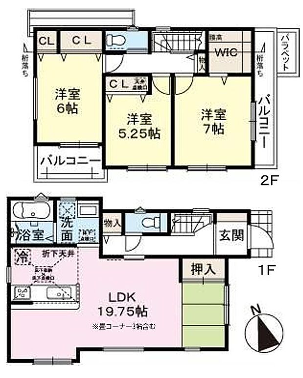 | 間取り | 4LDK 間取り内訳:リビングダイニングキッチン 16.7帖(1階)・和室 3畳(1階)・洋室 5.2帖(2階)・洋室 6帖(2階)・洋室 7帖(2階) |