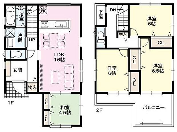 | 間取り | 4LDK 間取り内訳:和室 4.5畳(1階)・リビングダイニングキッチン 16帖(1階)・洋室 6帖(2階)x2・洋室 6.5帖(2階) |