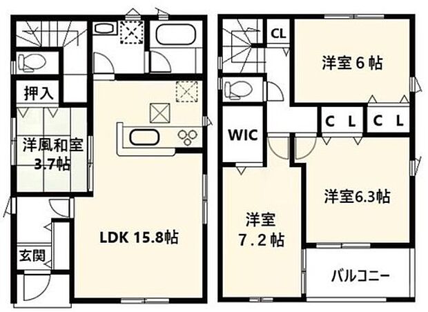 | 間取り | 4LDK 間取り内訳:リビングダイニングキッチン 15.8帖(1階)・和室 3.7畳(1階)・洋室 6帖(2階)・洋室 6.3帖(2階)・洋室 7.2帖(2階) |