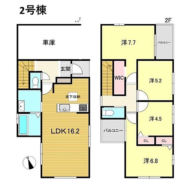 | 間取り | 4LDK 間取り内訳:リビングダイニングキッチン 16.2帖(1階)・洋室 7.7帖(2階)・洋室 6.8帖(2階)・洋室 5.2帖(2階)・洋室 4.5帖(2階) |