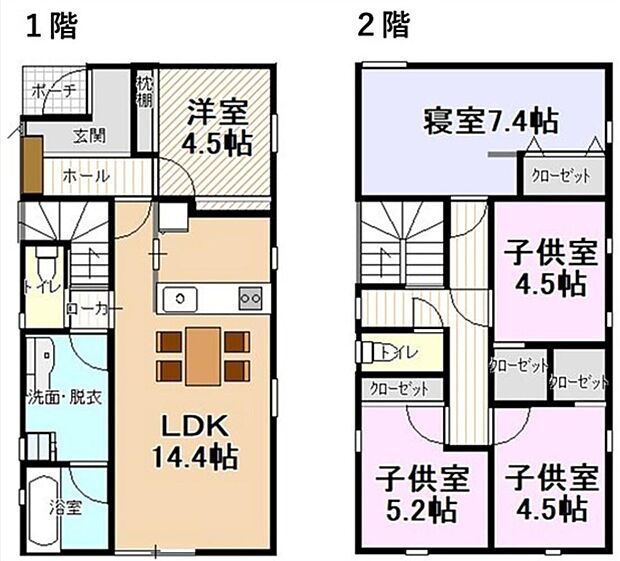 間取り内訳:リビングダイニングキッチン 14.4帖(1階)・洋室 4.5帖(1階)・洋室 4.5帖(2階)・洋室 4.5帖(2階)・洋室 5.2帖(2階)・洋室 7.4帖(2階)