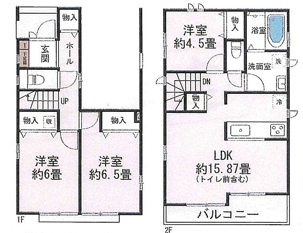 | 間取り | 3LDK 間取り内訳:洋室 6.5帖(1階)・リビングダイニングキッチン 15.8帖(2階)・洋室 4.5帖(2階)・洋室 6帖(1階) |